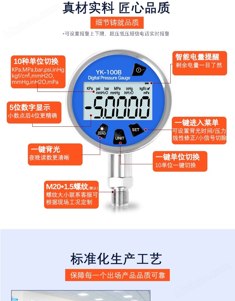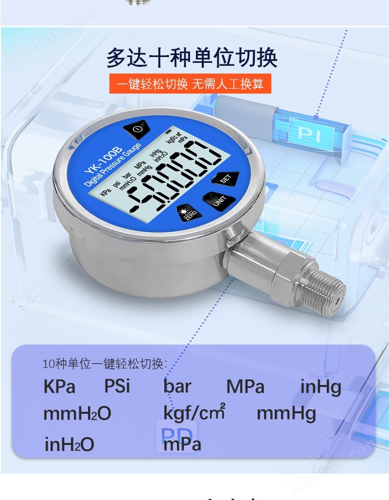 YK-100B帶RS485通訊數(shù)字壓力表,是我公司新推出的微功耗智能產(chǎn)品。它采用了微功耗器件以及特色的軟件處理技術(shù),可真實地連續(xù)測量壓力數(shù)值。內(nèi)置LI電池可24小時連續(xù)工作3年以上;它采用大屏幕段碼寬視角液晶顯示窗,讀數(shù)十分醒目、直觀。該產(chǎn)品出廠前,經(jīng)過了高低溫老化、應(yīng)力老化和溫度補(bǔ)償?shù)裙に?,即使?(0 ~ 50)℃ 范圍、一年時間內(nèi)、99% 置信概率的苛刻條件下,也能夠確保產(chǎn)品的準(zhǔn)確度。它主要用于校驗壓力(差壓)變送器、精密壓力表、一般壓力表、等其它壓力儀器儀表,也可廣泛用于需要精密測量壓力的場合等。它是指針式精密壓力表的更新?lián)Q代產(chǎn)品。
