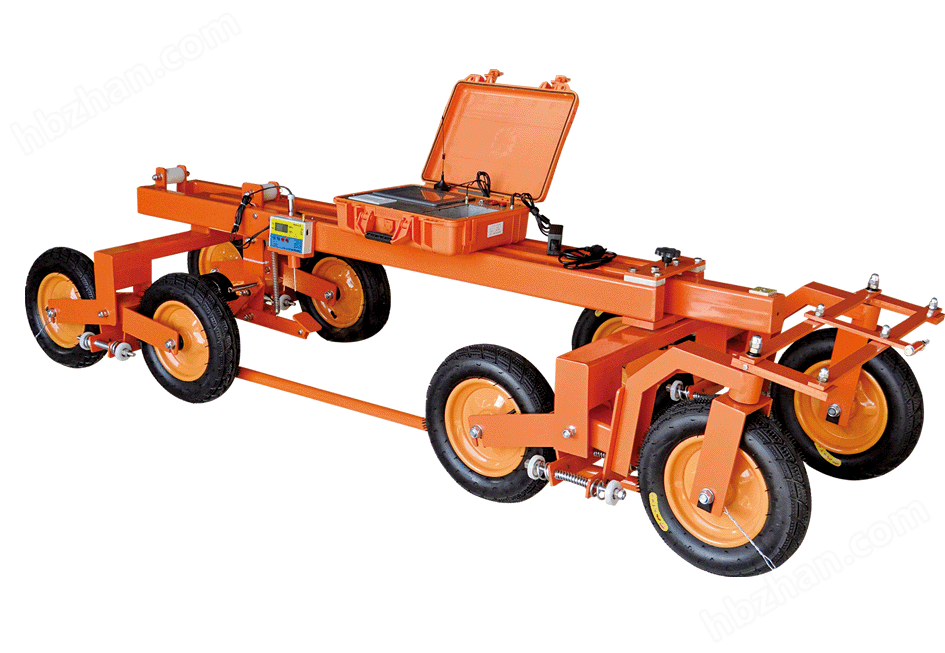 (二)牽引方式及檢測速度可人力或機(jī)動(dòng)車牽引,最小轉(zhuǎn)彎半徑5m,檢測速度不超過10km/h,測速為5-8km/h。非檢測情況(機(jī)架縮短,測量輪懸起)下牽引速度小于25km/h;