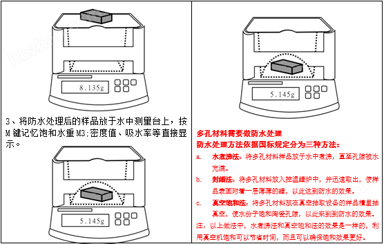 原 理:根據(jù)GB/T1933、ASTM、JIS、ISO標(biāo)準。可適用于煮沸飽和法、真空飽和法、封蠟法量測,采用阿基米德浮力法原理,直讀數(shù)值。