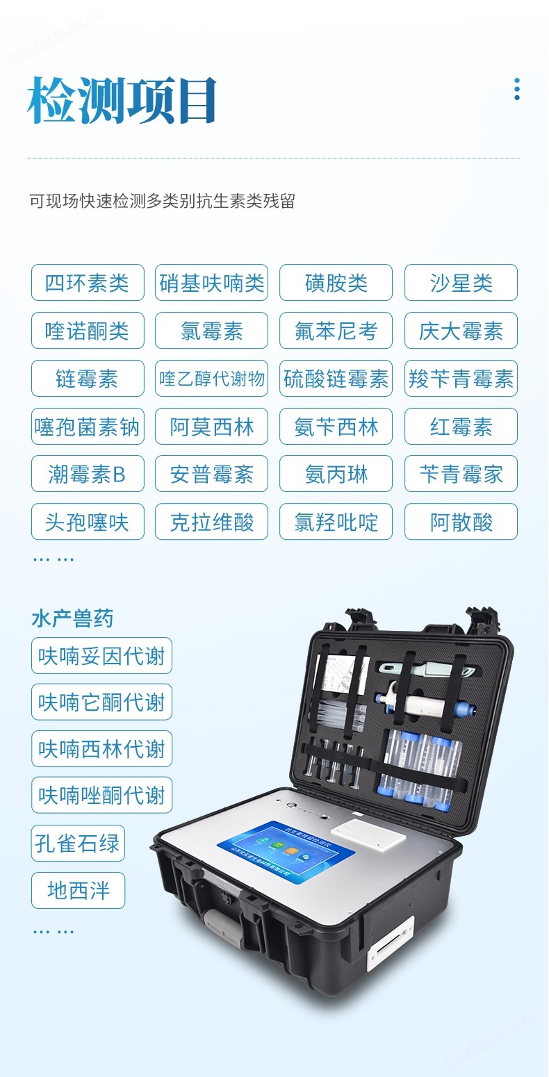 抗生素檢測儀可現(xiàn)場快速檢測多類別抗生素類殘留,如可快速檢測四環(huán)素類、硝基呋喃類、磺胺類、沙星類、喹諾酮類、喹乙醇代謝物、噻孢菌素鈉、潮霉素B、安普霉紊、氨丙琳、芐青霉家、頭孢噻呋、克拉維酸、氯羥吡啶、阿散酸等抗生素快速檢測;水產(chǎn)獸藥:呋喃它酮代謝、孔雀石綠等。