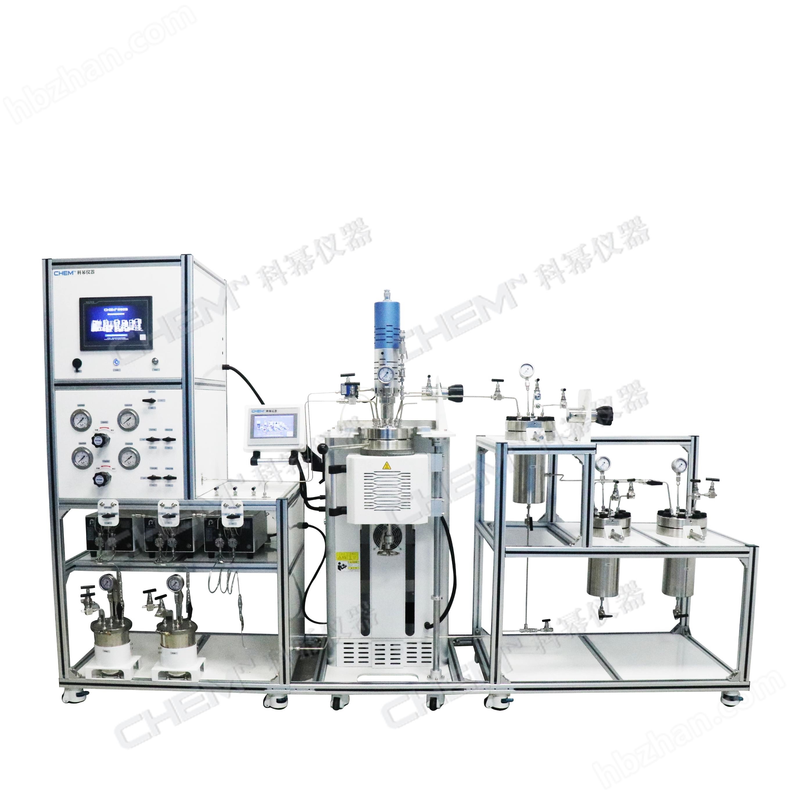 反應(yīng)物進(jìn)料為氣液兩相帶壓進(jìn)料,氣體(一氧化碳/氫氣)進(jìn)料通過(guò)氣體質(zhì)量流量計(jì)計(jì)量和控制,電磁閥聯(lián)鎖釜內(nèi)壓力,可實(shí)現(xiàn)自動(dòng)控制釜內(nèi)壓力和補(bǔ)氣操作,操作方便快捷且穩(wěn)定。
