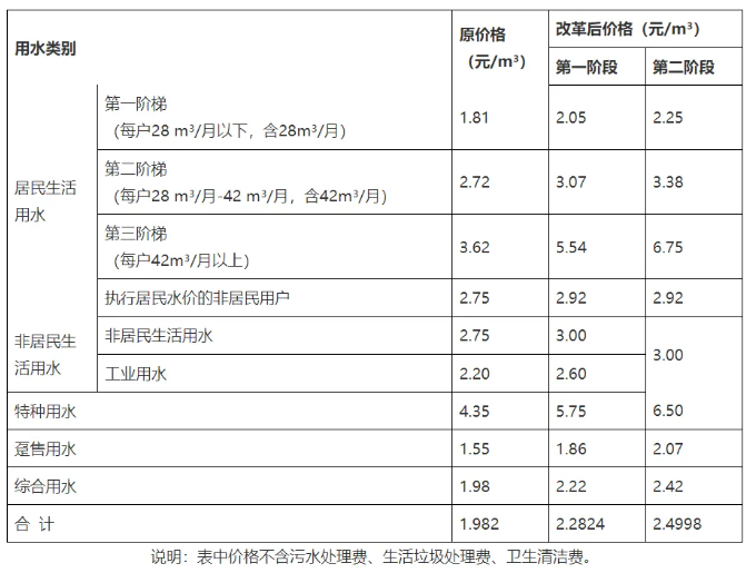 自來水綜合價格由3.449元立方米統(tǒng)一調(diào)整為3.8991元/立方米,漲幅13.05%,非居民用水價格統(tǒng)一調(diào)整為 4.76 元立方米;特種用水價格統(tǒng)一調(diào)整為20.00 元 / 立方米。