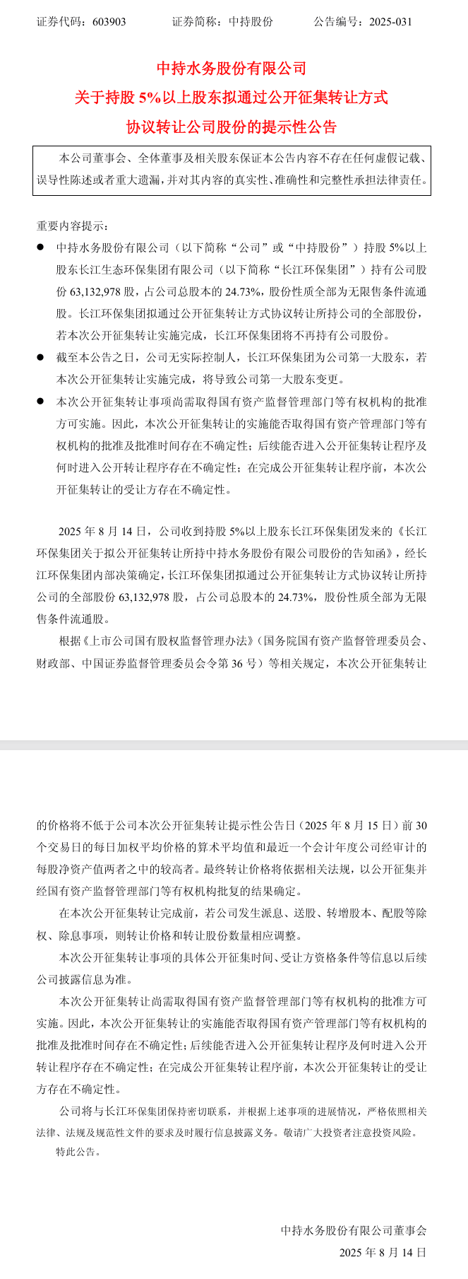 2025-08-15 10:42:51來源:中持股份 關(guān)鍵詞:水務(wù)長江環(huán)保集團(tuán)閱讀量:23754
