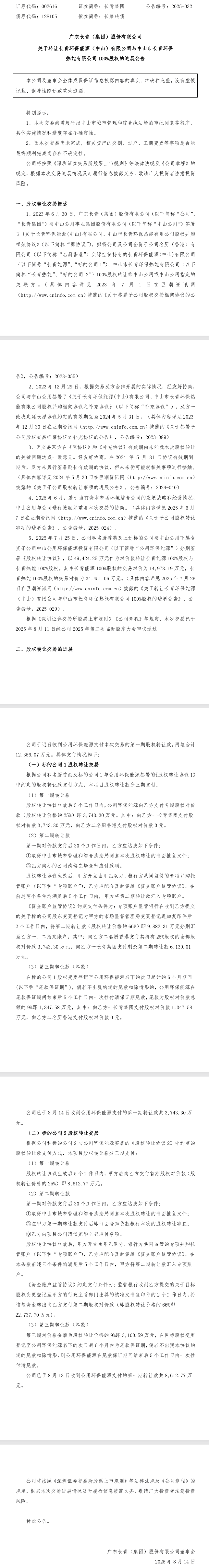 8月14日,廣東長(zhǎng)青(集團(tuán))股份有限公司(簡(jiǎn)稱:長(zhǎng)青集團(tuán))發(fā)布公告,關(guān)于轉(zhuǎn)讓長(zhǎng)青環(huán)保能源(中山)有限公司(以下簡(jiǎn)稱“長(zhǎng)青能源”)與中山市長(zhǎng)青環(huán)保熱能有限公司(以下簡(jiǎn)稱“長(zhǎng)青熱能”)100%股權(quán)的進(jìn)展情況。
