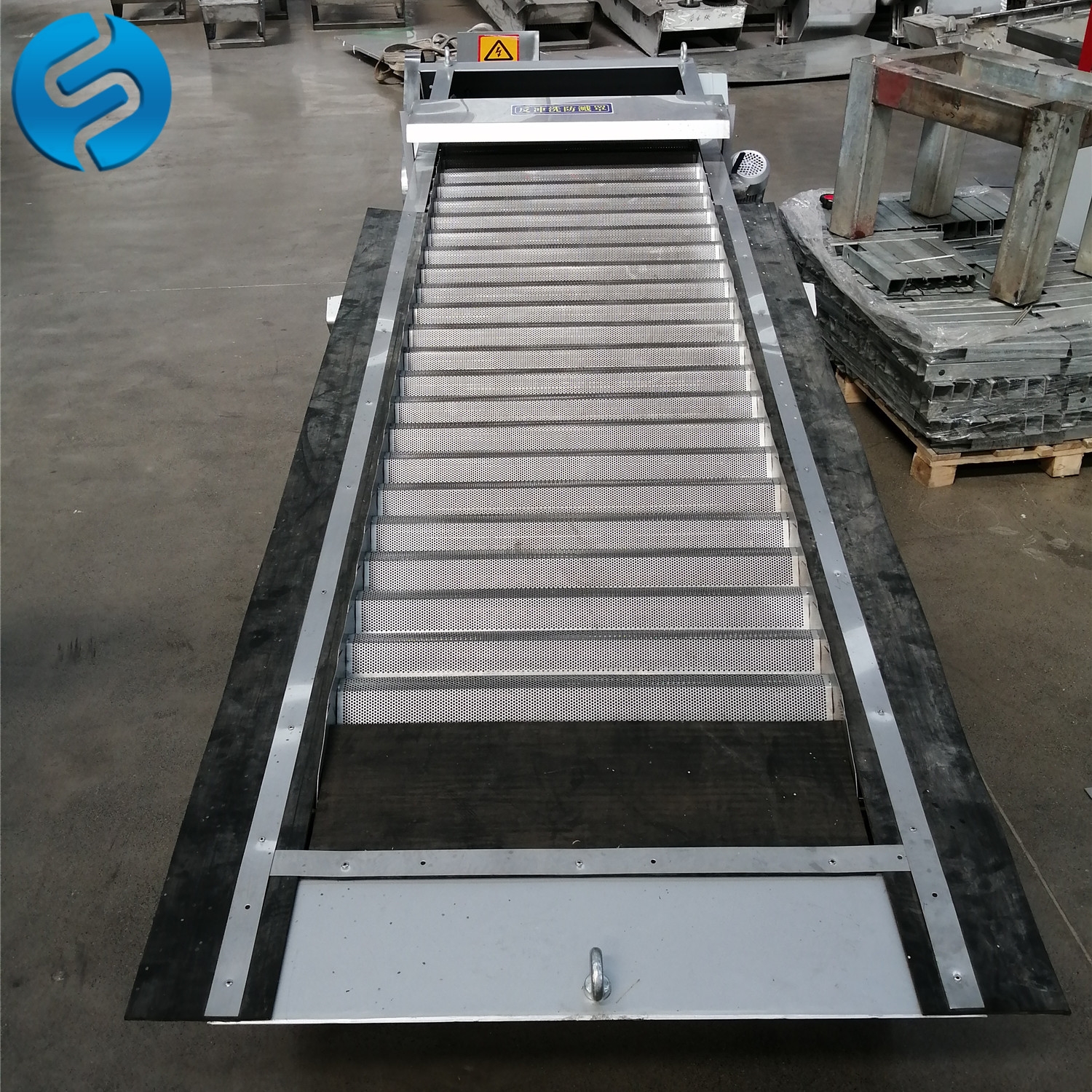 格柵撈渣機由以下部分組成:水渠中的檔水斜板、帶濾渣刮脫器的柵筐、帶有圓洞網(wǎng)板的漏斗、柵筐、柵筐的底板、耙齒、刮渣器、清潔臂、洗刷棒、軸承軸頭、漏斗、內(nèi)帶導桿的外螺管、旋轉(zhuǎn)螺桿、支撐腳、壓縮器、集水外套
