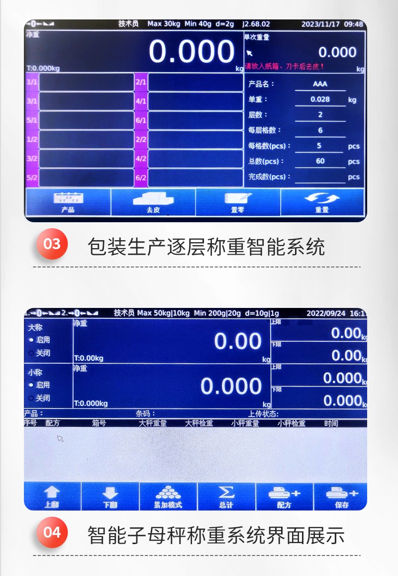 配方管理,精準高效: 系統(tǒng)支持通過U盤或電腦端后臺軟件批量導入配方數據。在稱重時,操作員只需選擇對應配方,系統(tǒng)便會自動按序引導投料,并實時顯示當前物料的上、下限標準。重量合格時顯示綠色,超差時以紅/黃色警示并伴有蜂鳴,杜絕錯配、漏配。