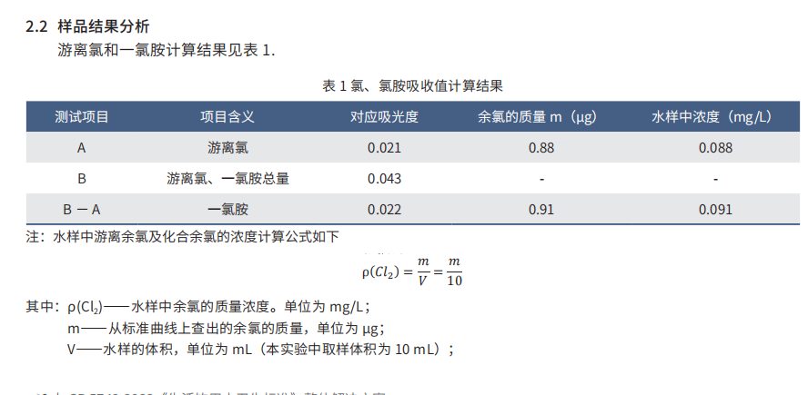 含氯消毒劑毒性低,且具有良好的殺菌作用,在減少病原微生物污染,防止感染有重要作用,因此在各用水領 域的消毒中被廣泛使用。水體經(jīng)加氯消毒,接觸一段時間后有適量的氯留存于水中,用來保證持續(xù)的殺菌能力。水 中余氯有總余氯、游離余氯和化合余氯三種存在形式。游離余氯為氯氣溶到水里的形態(tài),和亞氯酸、氯酸一樣,具 有較強的氧化性,還具有殺菌性。但是當余氯含量過高時,容易引起水質二次污染,常引發(fā)有機氯化物等致癌物質 的產(chǎn)生,引起溶血性貧血等,對人類健康有一定的危害作用。因此有效地控制和檢測余氯含量在水處理中至關重要。 目前我國對給水處理廠出水、供水管網(wǎng)末梢、生活排放污水以及某些特定行業(yè)產(chǎn)生的廢水中余氯均有明確要求, 其中對于生活飲用水供水管網(wǎng)末梢水中余氯不得低于 0 檢驗方法 消毒劑指標》檢測方法,使用島津 UV-2600 紫外可見分光光度計對自來水中游離氯和氯胺等消毒劑指標 .05 mg/L,本文參考 GB/T5750.11-2022《生活飲用水標準 進行了測定。