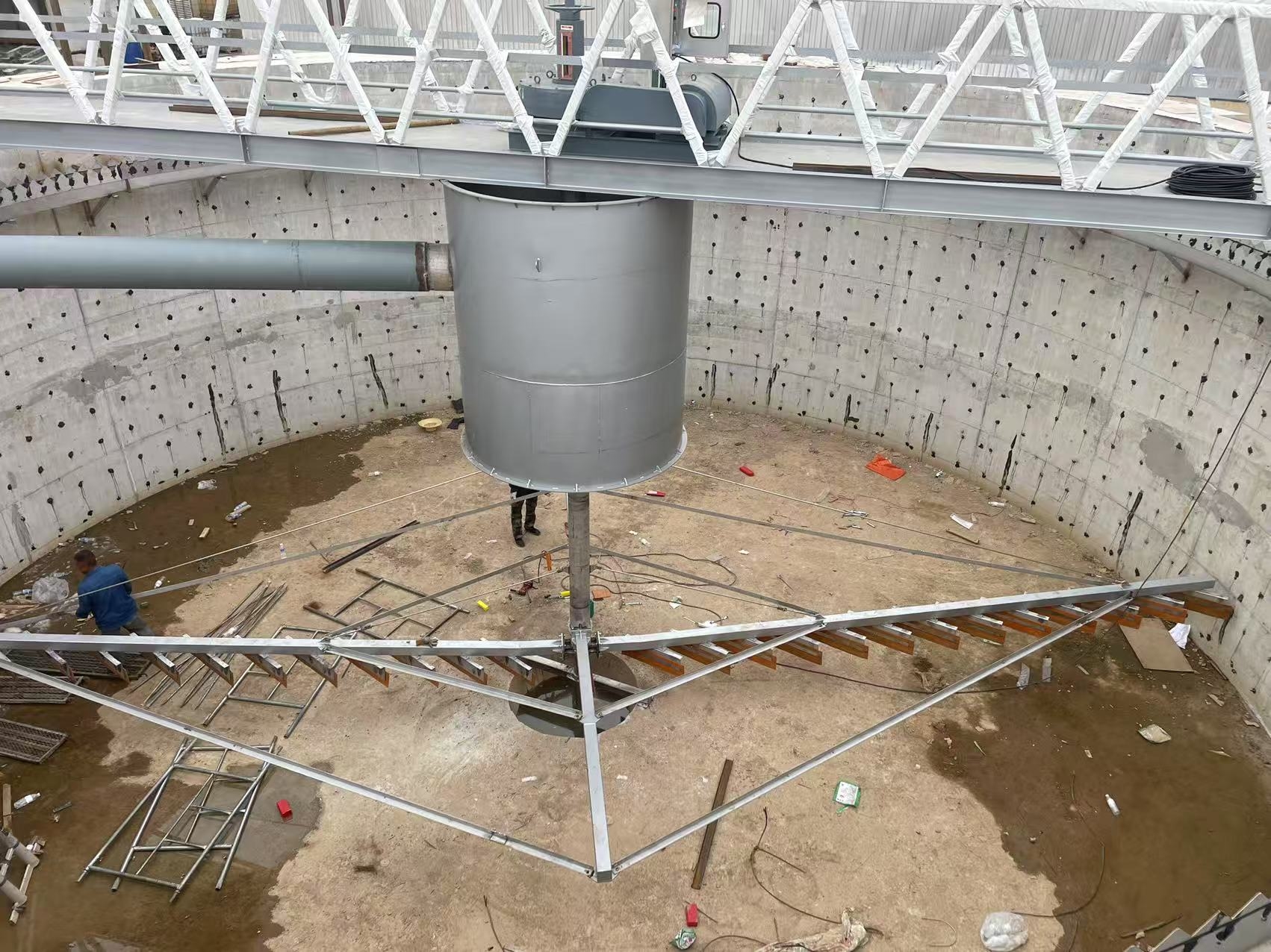 主要由主梁、中心支座、傳動(dòng)裝置、吊架、刮泥裝置、刮板、穩(wěn)流筒等部件組成。由池中心的支墩和池沿上行走的車輪支承主梁,主梁的一端與在中心支墩上的中心支座鉸接,另一端與裝有包括減速機(jī)在內(nèi)的傳動(dòng)裝置聯(lián)接。該機(jī)以支墩上的中心支座為軸沿池圓周作回轉(zhuǎn)運(yùn)動(dòng)。在主梁下部裝有刮集裝置,底部的刮泥板將池底的污泥刮到池中心的排泥槽內(nèi),再由*下端的小刮泥板隨刮泥機(jī)轉(zhuǎn)動(dòng)將排泥槽污泥攪動(dòng)防止板結(jié),污泥經(jīng)排泥管排出池外。