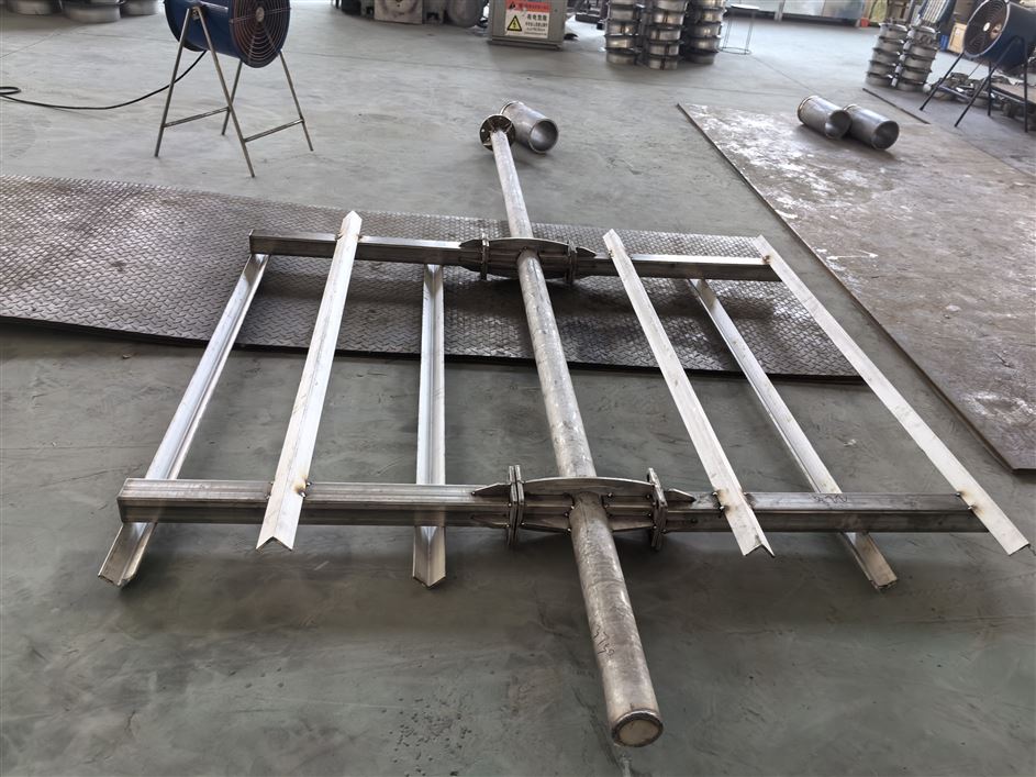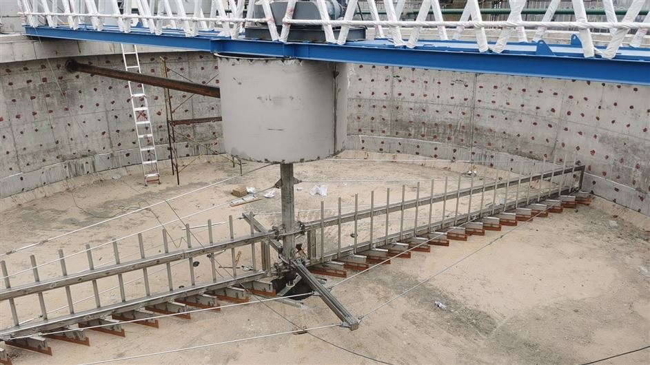 主要由主梁、中心支座、傳動(dòng)裝置、吊架、刮泥裝置、刮板、穩(wěn)流筒等部件組成。由池中心的支墩和池沿上行走的車輪支承主梁,主梁的一端與在中心支墩上的中心支座鉸接,另一端與裝有包括減速機(jī)在內(nèi)的傳動(dòng)裝置聯(lián)接。該機(jī)以支墩上的中心支座為軸沿池圓周作回轉(zhuǎn)運(yùn)動(dòng)。在主梁下部裝有刮集裝置,底部的刮泥板將池底的污泥刮到池中心的排泥槽內(nèi),再由*下端的小刮泥板隨刮泥機(jī)轉(zhuǎn)動(dòng)將排泥槽污泥攪動(dòng)防止板結(jié),污泥經(jīng)排泥管排出池外。